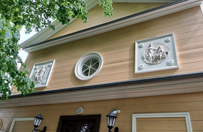 На табличке рядом с флигелем сказано, что его фасад украшает пара барельефов на античные сюжеты – «Геракл и Омфала» и «Гера и Зевс». Такая пара висит под фронтоном с часами спереди, и точно такая же – под фронтоном сзади. Сейчас я показываю вид сзади.
