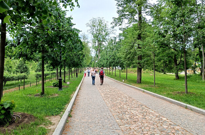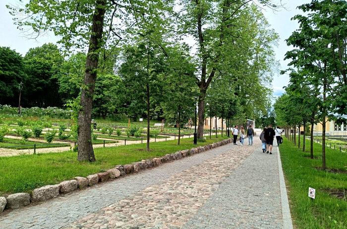 Мы приближаемся к небольшой «площади» с Главным усадебным домом и Библиотечным флигелем (они проглядываются за деревьями). По пути можно обратить внимание на садик слева от главной дорожки. Изначально с рубежа XVIII–XIX веков тут и были фруктовые сады, но сами понимаете, что времена менялись, посадка менялась, и сейчас многое приходится восстанавливать. Современным вариантом сада озаботились после последней реставрации Монрепо в 2020 году.