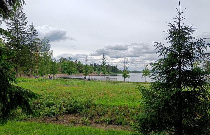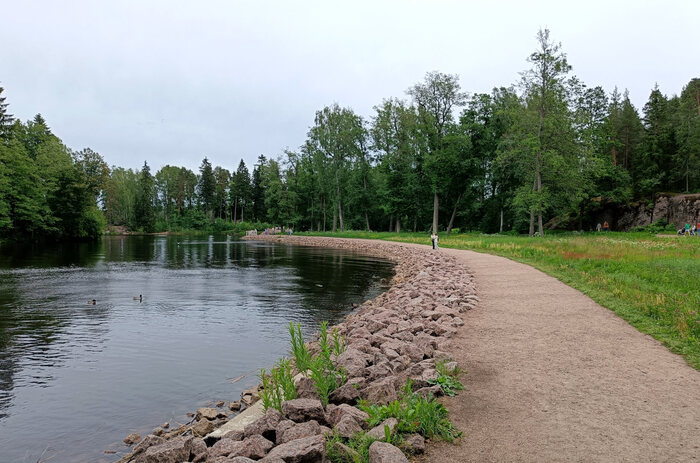 На самом деле идти до берега довольно быстро, мы бы его увидели прямо с возвышенной «площади» Главного усадебного дома. Дом стоит примерно в центре исторической части Монрепо, изрезанной тропинками и усыпанной разными достопримечательностями. Всего в длину вдоль берега можно гулять чуть больше километра.