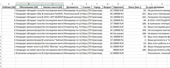 К примеру, мне нужно показать кандидатов руководителю отдела продаж. Скидывать ссылки в мессенджер неудобно. Поэтому я добавил кнопку «Скачать отчет в Excel». Система формирует аккуратную таблицу. В ней есть колонки: ФИО, Ссылка, Зарплата, Телефон и, самое главное, — Комментарий ИИ и Вопросы.