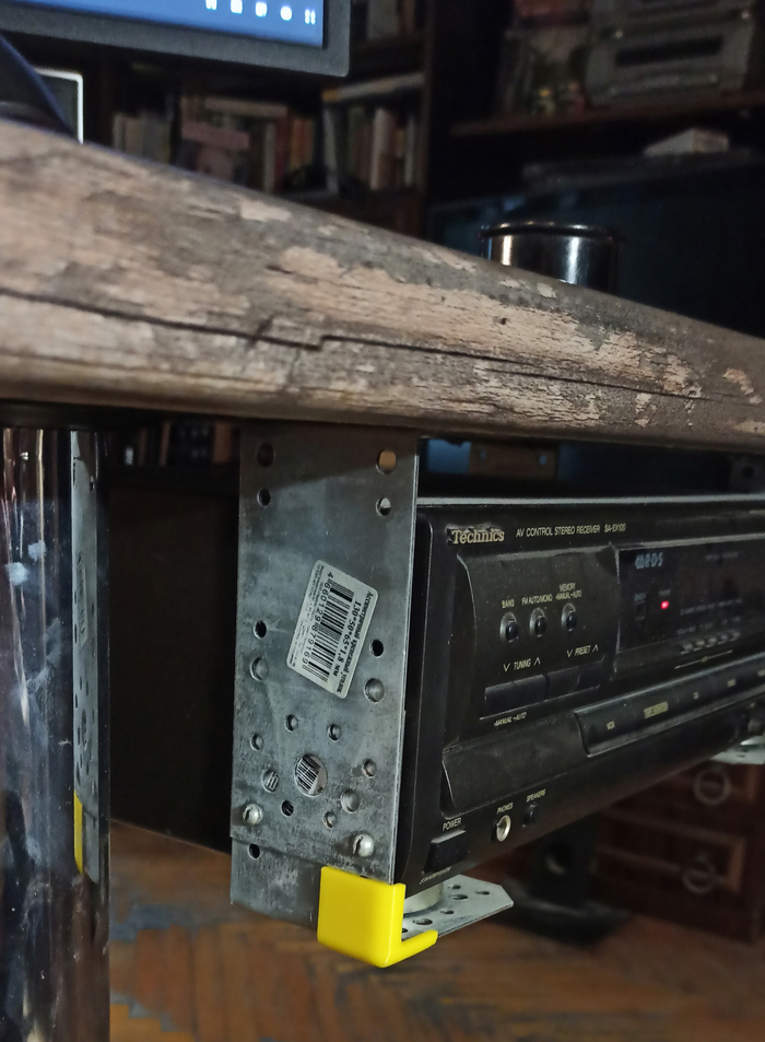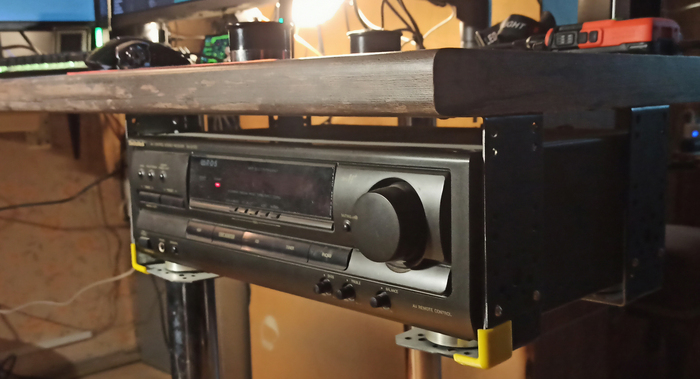 Чтобы комфортно слушать с компа музыку, усилитель я подвесил под столешницу. На уголках.