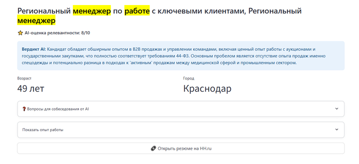 Если мне нравится кандидат, я нажимаю «Показать опыт работы», и разворачивается детализация, где уже подсвечены ключевые навыки, которые я искал.