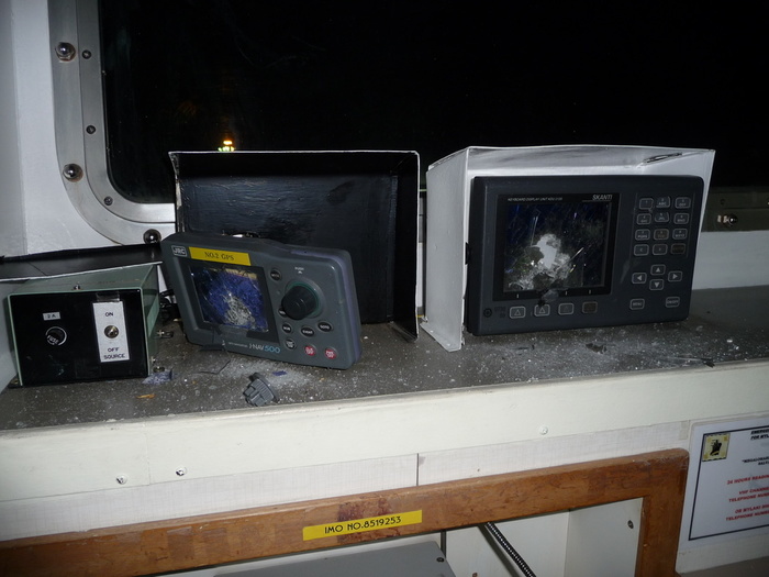 Зайдя на мостик, сказать что я @хуел, будет мало сказано. На мостике был полный беспредел, все было разбито, было много дырок от пуль и везде лежали гильзы. Посмотрев на лево, я увидел как лежит капитан с открытыми глазами и весь в крови, я ещё подумал что его убили, он кстати остался жив, в него выстрелили из какой то самодельной дроби, а в виду внушительных размеров живота, вся дробь осталась снаружи. Все остальные лежали на палубе, головами в низ и руки на голове. Я тут же лёг. Пролежал я так минут двадцать, все это время все лежали, а пираты ходили вокруг нас и как то избирательно пинали. Так возле меня лежал, второй механик, когда его пнули, он так ахнул, что я подумал, его ножом пырнули. И было как то реально страшно. Потом меня подняли, подняли и матроса с которым я был с самого начала, сварщика бразильца и четвёртого механика. Нас повели по каютам, делать шмон.