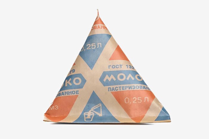 Дизайн упаковки был поистине узнаваем: белоснежный картон с яркими голубыми и красными треугольниками, гордая надпись «МОЛОКО» и объём 0,25л. Эти пакеты появились в начале 1960-х и мгновенно завоевали сердца советских граждан.