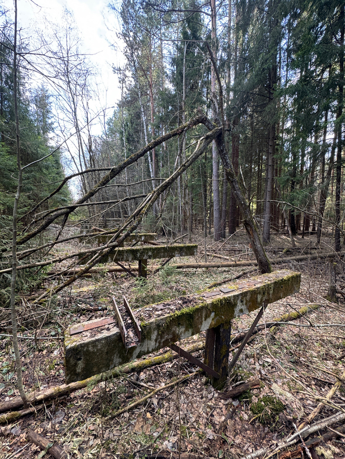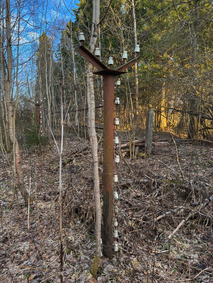 Дорога из аэродромных плит, которой нипочем ни погода, ни время, ведет нас в нужном направлении. Вдоль нее тянутся опоры, на который раньше был уложен то ли кабель, то ли трубопровод - сейчас определить это уже невозможно. Опоры основательно поросли мхом, но кое-какие металлические детали на них еще остались. Это очень странно, учитывая тот факт, что в свое время объект был желанной целью охотников за металлом.