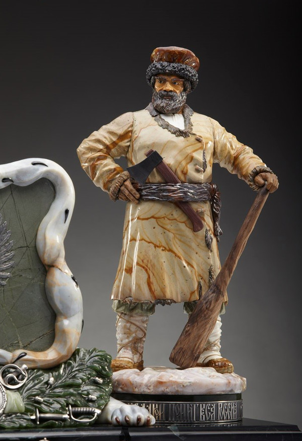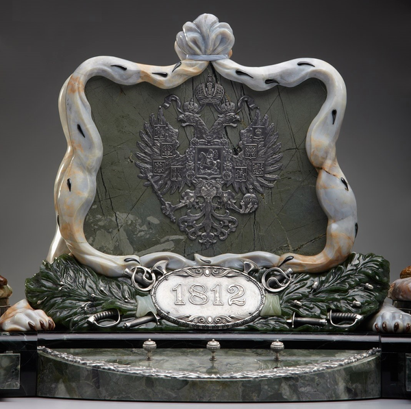 Посвященный войне 1812 года письменный прибор — пример современного решения таких настольных предметов: боковые части подставки прячут два ящичка для канцелярских мелочей, центральная часть, украшенная изображением императорской мантии (халцедон, черный кремень) и государственным гербом России (серебрение, латунь, чернение), — подставка для бумаг. Сочетание зелёной яшмы, из которой выполнено основание прибора, и похожего на снег халцедона в основании фигур напоминает о том, что суровая русская зима и густые леса способствовали победам партизан, изображённых в скульптурах.