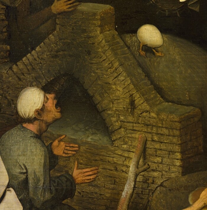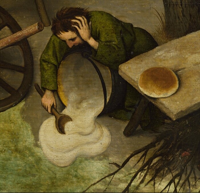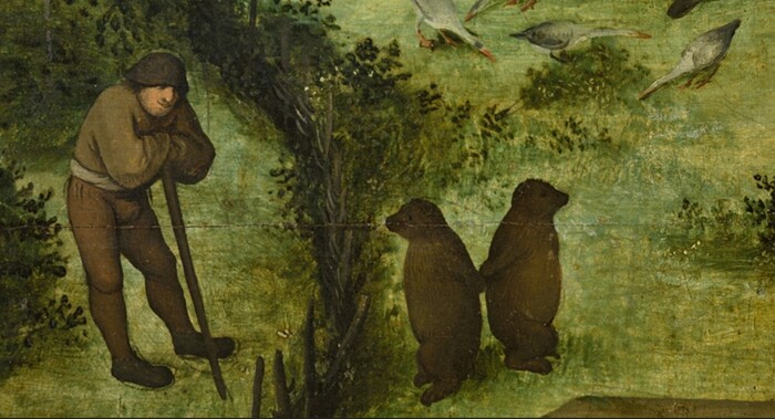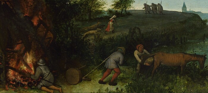 Начала благодаря источникам от профессора изучать особенности техник Брейгеля. Нашла академический аргумент в пользу высказывания подруги - “In Hunters in the Snows, for instance, it is early coats of a startling lemon yellow glowing through many layers put on later that lend luminous inner warmth to the solid brown fronts of the peasant house in the left foreground.”