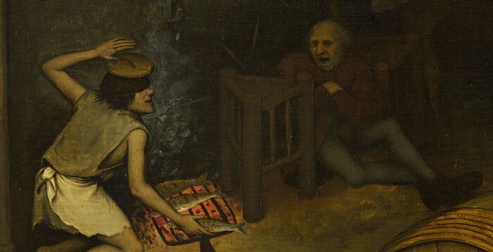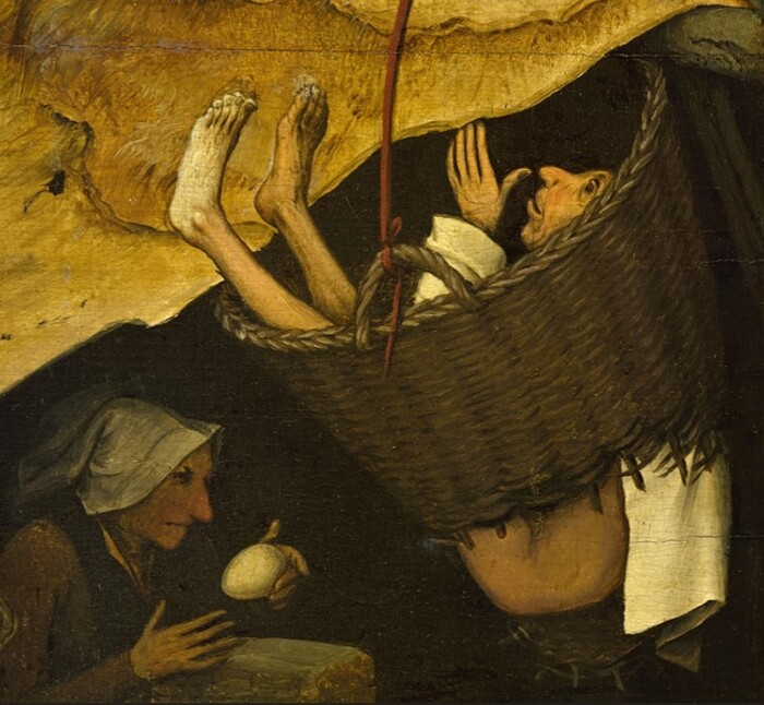 Есть легенда (она в основе картины) про женщину, которая сошла с ума. В её жизни было слишком много горя. Умерли родные, сгорел дом. Она все сносила, но до той поры, пока не пропала её сковородка. Тогда Грета надела доспехи, взяла меч и пошла в Ад воевать с Дьяволом. Она слышала, что у него лучшие сковородки. Вот тут и пришло время Босха в жизни Брейгеля. Мы видим Грету, которая, не обращая внимания на все, что творится вокруг, идет к своей цели. Но её фигура комична. В правой руке она сжимает меч, на ней латы и шлем, а левой пытается удержать все добро, оставшееся от прошлой жизни. Не лучшая тактика для нападения. Кроме того, она даже не замечает, что сковородка, из-за которой она потеряла разум и отправилась на войну, все еще находится в её корзине. А на заднем плане женщины обороняют свой горящий дом от чертей, сражаясь не хуже профессиональных солдат. Грета слепа. Слепа не в прямом, а в переносном смысле. Но таковы почти все люди. Питер Брейгель Старший, видевший слишком хорошо, знал это как никто другой...