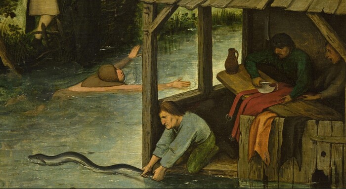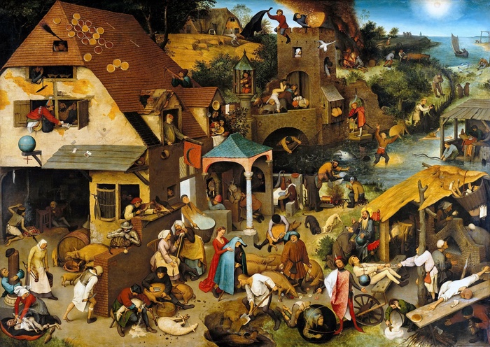 "Притча о слепых", 1568 г. Техника: Масло, темпера. Материал: Холст. Размер: 86×154 см. Оригинал хранится в Национальном музее Каподимонте, Неаполь, Италия.