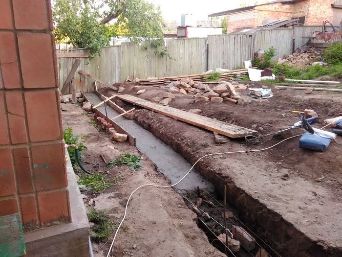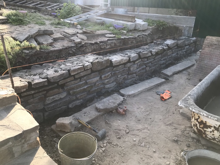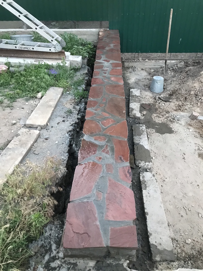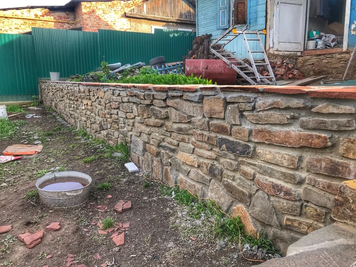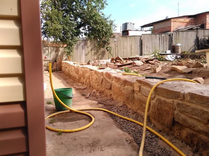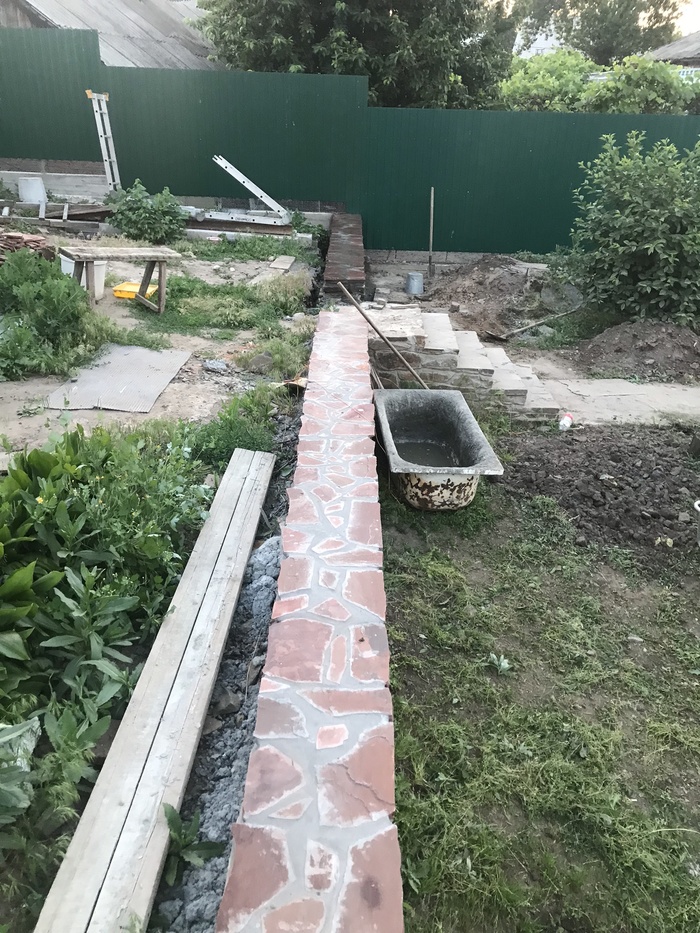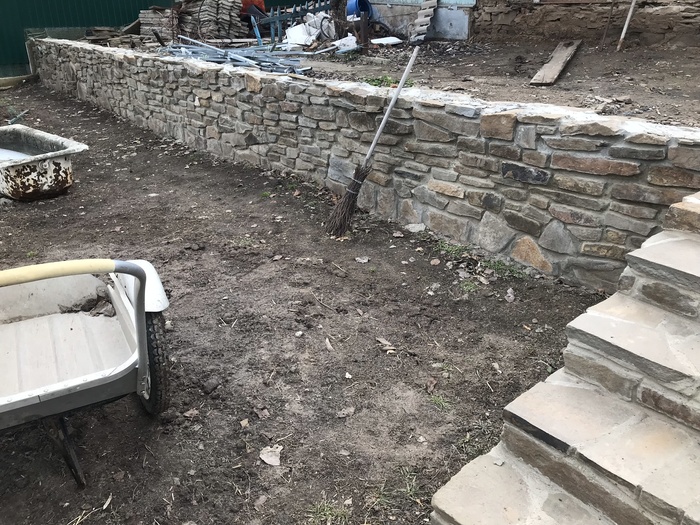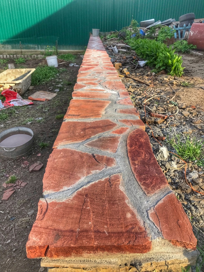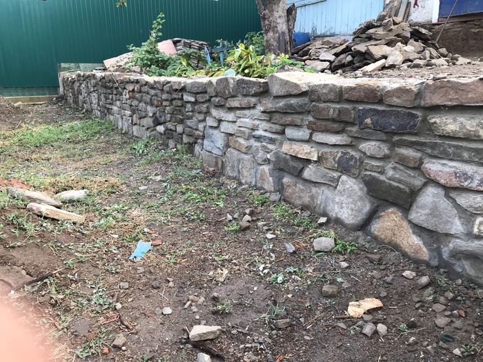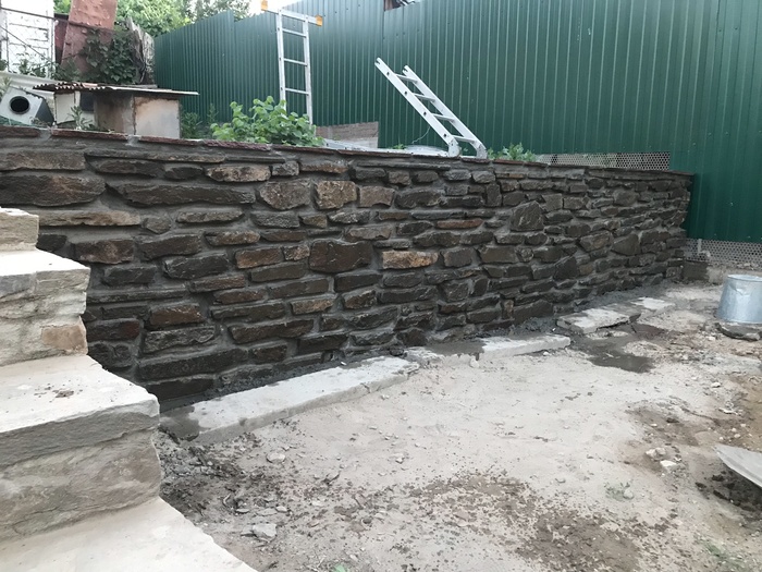 Доброго времени суток. Решил сделать свой первый пост на тему как выложил стенку из камня, возможно кому то это будет интересно. Начну с того что весь участок был не ровный, шел под склоном и на сколько смог я его заровнял, но верхний слой земли был на много выше, возможности загнать трактор туда не было, нет заезда во двор. По этому решил чтобы не снимать высокий слой земли, сделать стену из камня, она и декорирует землю и держит. В общем начал с того, что прокопал траншею см 30 глубиной, если стена не высокая, этого с головой, просыпал подушку из песка и щебенки, желательно обвязать арматуры для того чтобы бетон был моналитным и залилить бетоном,  ширина стенки была 35 см., длина примерно 10 метров. После того как пролил бетон, он постоял неделю, начал ложить камень в пропорции цемента и песка 1 к 3 соответственно. Забиваете арматуру в края бетона, крепите шпагат, леску по обеим сторонам, и по ней равняете стенку. По мере подьема стены, подымаете леску выше, чтобы она не мешалась и сверху было удобно контролировать уровень стены. Тем кто будет ложить камень, могу посоветовать от лицевой стороны, когда ложите раствор отступайте см 2, можно приложить 2 пальца и кидать раствор, когда камень будите придавливать, он его выдавит и после этого пальцами убираете лишний раствор. Так получается шов немного утопленным, по мне так красивее, хотя раньше я делал его практически за под лицо, слегка утапливал. В общем когда утапливаете шов, видна больше структура камня. Я слегка забивал камень резиновой киянкой. Задняя часть камня у меня была в земле, поэтому с ней вообще проблем нет, выводить швы не надо, можно просто кидать камень на черную и закидывать раствором. Та часть которая будет видна, выводите швы и подгоняете камень. Чуть не забыл, перед кладкой камня, не ленитесь промойте камень и почистите его щеткой по металлу, чтобы убрать с него грязь и мелкую пыль, которая если не счистить, со временем камень на швах может отслаиваться и трескаться. Самое главное перед тем как ложить, без раствора подбирайте камни и выкладывайте их на сухую, чтобы была видна картинка, что получится, а потом убираете крайние камни и начинаете последовательно выкладывать, если камень не ложится или плохой получается шов, меняйте его на другой, большие камни хорошо бьются кувалдой, в одну точку удар, два и он разделился. Верх камня я вывел пластушкой красного цвета, она прожженная в печи. Верхний слой пластуна, подбираете на края ровные стороны, можно его колоть и подбирать, но лучше всего если камень не ровный, взять болгарку, отчертить линию и отрезать нужную форму, так вы получите идеальный камень и расхода меньше. Когда будите обкладывать пластуном и где то в вашей плоскости стенки был выше уровень, легче будет начать с выпуклой части и от него начать уровень. Раствор лучше чтобы был слегка суховатый, но не сильно, чтобы камень не уплывал, если много воды в растворе, раствор начинает вытекать и пачкать весь камень, да и сам камень начинает проваливаться или уплывать за уровень и потом тратится много времени чтобы его нормально поставит, но к этому быстро приловчитесь. После кладки камня, по мере застывания раствора, обычно если тепло или жарко, через час-два, нужно идти зачищать швы, пальцем проходите все проложенные швы, чтобы они были гладкие. Камень чистите от раствора той же щетко