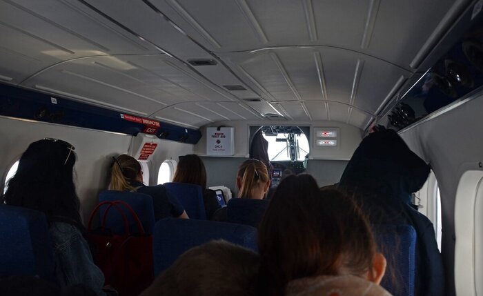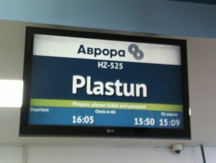 Поначалу всё как обычно. Приехали в аэропорт, “уважаемые пассажиры, у стойки №11 начинается регистрация пассажиров и оформление багажа на рейс Аврора-525 в Пластун”. Прошли досмотр, “от выхода такого-то начинается посадка на рейс Аврора-525”.