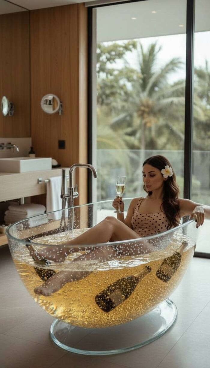 Фотореалистичное изображение в высоком разрешении, рекламно-кинематографический стиль. В центре сцены полноразмерная овальная ванна, стилизованная под пивную кружку, с прозрачным толстым стеклом и янтарной жидкостью с белой пеной, внутри которой плавают стеклянные бутылки. Ванна длиной с тело человека, с массивной стеклянной ручкой, толстыми стенками и тяжёлым дном. Внутри сидит взрослая женщина в розовом купальнике в горошек, расслабленная, с вытянутыми и скрещенными ногами, светлыми волосами с цветком, смеётся, естественная кожа, реалистичная анатомия. Интерьер — современная luxury spa ванная с тёплыми деревянными поверхностями, полотенцами, минималистичной раковиной и смесителями, на заднем плане панорамное окно с видом на террасу и природу, дневной мягкий свет. Камера чуть выше ванны, фокус на ней и женщине, фон слегка размыт. Освещение мягкое, подчёркивающее прозрачность стекла, толщину стенок, золотистый цвет жидкости, текстуру пены, естественный блеск кожи. Стиль: ультрареализм, high detail, cinematic lighting, realistic glass refraction, global illumination, shallow depth of field, advertising photography, 8K. NEGATIVE PROMPT (ОБЯЗАТЕЛЬНО): маленькая кружка, обычная пивная кружка, декоративная кружка, чашка, бокал, неправильный масштаб, человек не помещается, мультяшный стиль, аниме, пластиковая кожа, искажённая анатомия, лишние конечности, неправильные пропорции, размытое лицо, логотипы, текст, водяные знаки, AI artifacts.