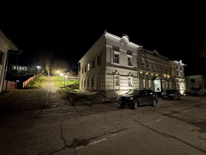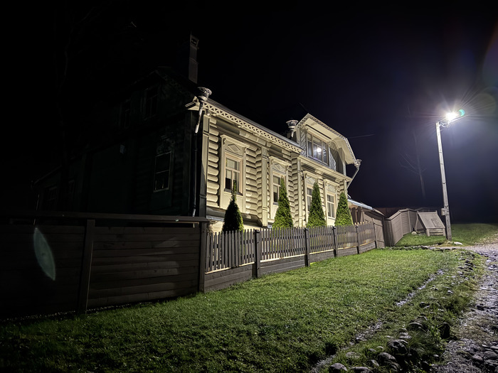 Как я уже писал, приехали мы в 9 вечера. Хоть уже детям и нужно было спать, но ехали часов 6, поэтому было решено пройтись по вечернему темному Плесу. Поселились мы в квартире такого дома: