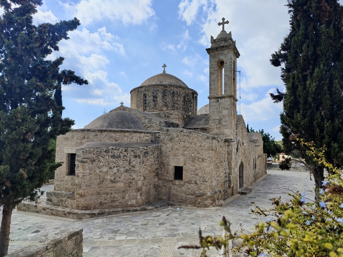Старинная церковь Панагии Хриселеусы (Божьей Матери Золотой Милосердной) находится на центральной площади деревни Эмба (в 3 км к северу от Пафоса)