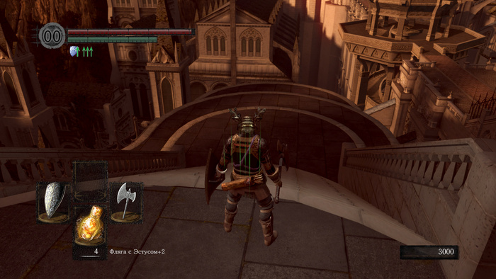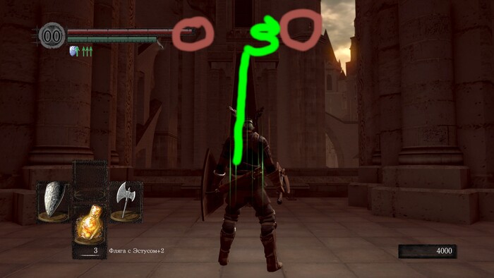 В чём соль всей ситуации: мне нужно пробежать по крыше здания (путь указан зелёной стрелкой). Дорога узкая, перил не имеется, любой случайный шаг за край крыши и обратно к костру. О костре я расскажу чуть позже, а пока мало же узкого пути без права на ошибку, так здесь стоят два рыцаря с луками. Одно попадание по вам и вы так же летите с крыши. Но есть же щит? Да, он помогает, и стамину полностью они не могут выбить. Только, если бы данные рыцари были только лучниками, при приближении к ним они благополучно убирают луки и достают мечи. А, чтобы вы понимали данные рыцари огромная боль в заднем проходе, особенно для новичка, что только учится играть в данный жанр игр. Так же не забывайте об узком участке с которого вам нельзя свалиться и рыцарь, что идёт на вас и убьёт с пары тычек. Остаётся надеяться только на то, что он свалится и мне всё же повезло, он свалился и я прошёл к следующему костру.