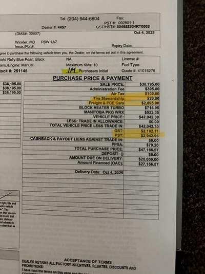 По цене: Subaru WRX 2025 в комплектации Sport стоит 42к баксов. Они производятся в Японии, следовательно это цена с импортными пошлинами. Сюда подкидываем GST и HST, всякую дрочь типа экосбора на шины, опции в виде ковриков (надо было отказаться, бляха, за эти деньги можно было заказать самому получше) и блока обогрева двигателя. В итоге получаем 47к баксов на картинке ниже. 27к баксов занимаем (не забываем внесенную первоначалку 20к) на 5 лет под 5 процентов, что в итоге даст нам 3500 примерно переплаты, что меньше одной моей месячной зп чистыми. Сам же кредит выходит 512 в месяц, а так же страховка (тут она аналог КАСКО, и на новые авто довольно дорогая) 200 баксов (что будет снижаться с возрастом авто и ростом страховочного рейтинга). Итого машина в месяц мне стоит 700 с небольшим баксов.