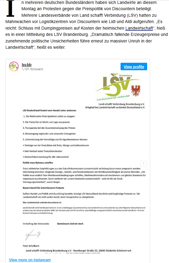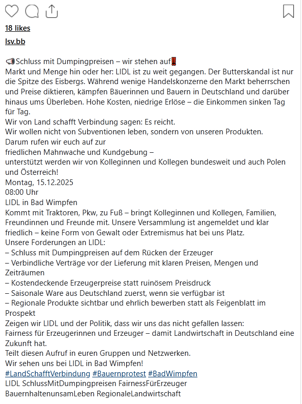 В нескольких федеральных землях Германии фермеры в этот понедельник присоединились к протестам против ценовой политики дискаунтеров. Несколько региональных объединений организации «Земля создаёт связь» (LSV) призвали к молчаливым акциям протеста перед логистическими центрами дискаунтеров, таких как Lidl и Aldi. «Хватит: прекращение демпинговых цен за счёт отечественного сельского хозяйства», — говорится в сообщении LSV Бранденбурга. «Резко падающие цены производителей и растущая политическая неопределённость вновь приводят к массовому недовольству в сельском хозяйстве», — отмечается далее.