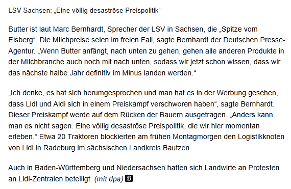 «Я думаю, все уже слышали и видели в рекламе, что Lidl и Aldi вступили в сговор в ценовой войне», — сказал Бернхардт. Эта ценовая война ведётся за счёт фермеров. «Иначе и не скажешь. Совершенно катастрофическая ценовая политика, которую мы сейчас наблюдаем». Около 20 тракторов заблокировали в ранний понедельник утром логистический узел Lidl в Радебурге, район Баутцен в Саксонии.