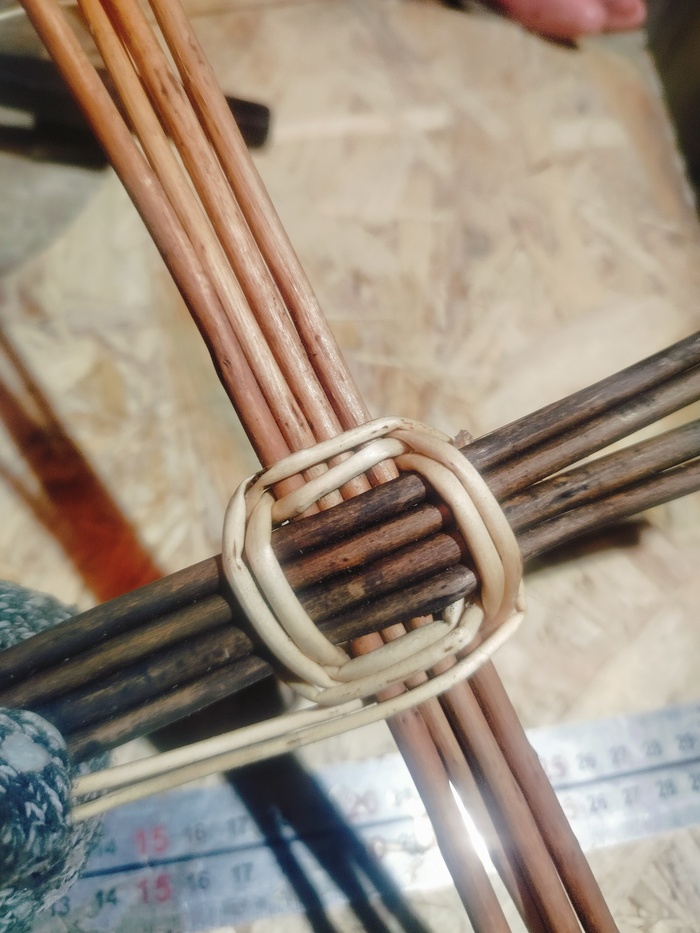 Как видим крест 3*3 сделан из свежего, неокоренного прута, то есть максимально мягкого. Ещё одна важная деталь, это прут. Прут весеннего сбора, что очевидно из фото И собирался когда листочки на прутике были большого размера, и прут был достаточно рыхлым То есть более низкая плотность древесины , большое расстояние между стойками, помогает «почувствовать вкус победы»). По моей просьбе на стеночки было подставленно по две стоечки, но сил развести их не хватило. Поэтому получилась немаленькая корзинка, всего на 12 стоек