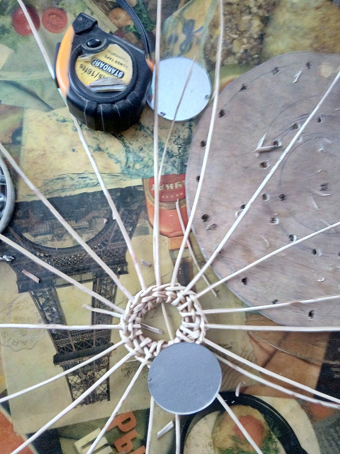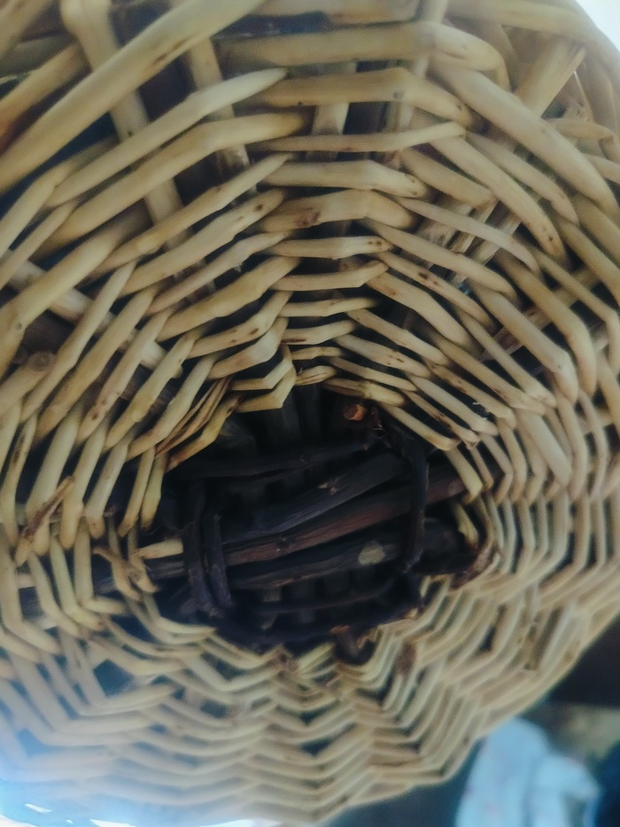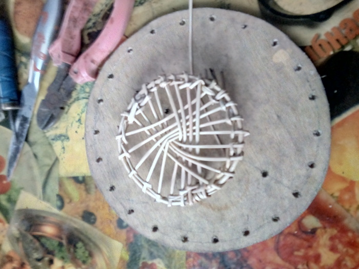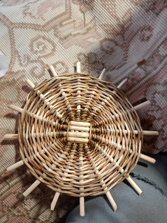 ЕЩЁ одна замечательная работа , другого человека. Скрученное донышко – начало для корзинки( естественно есть продолжение). Человек полностью «автономен от меня», всего добивается сам. Мне кажется, это очень важное качество. Пока идёт по « нашему пути», добротные прутья, жестокое плетение. Я в восторге. Что ещё более подогревает моё восхищение, это девушка.