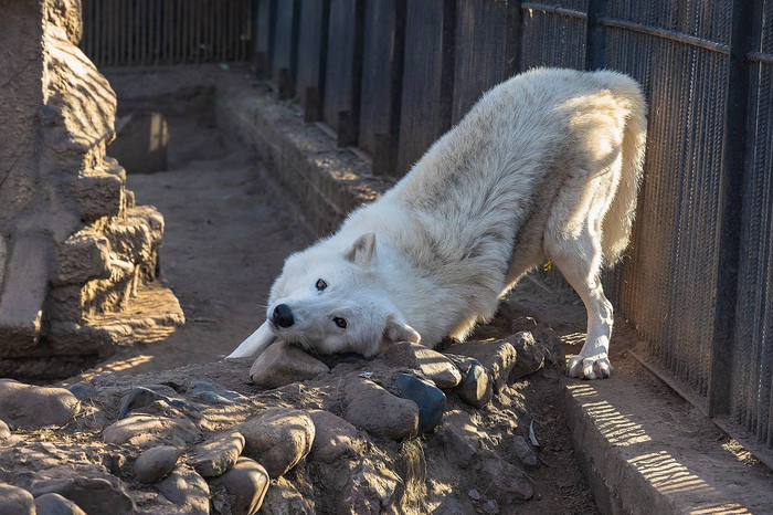 Годовалый арктический волк прилетел в Калининградский зоопарк из Красноярского зоопарка «Роев Ручей», где родился и жил вместе с родителями.