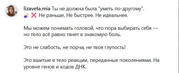 Один из показательных примеров — Лизавета Мязина, публично позиционирующая себя как психолог и коуч. В её текстах и сторис регулярно воспроизводится именно эта логика: отказ от ответственности под видом заботы о себе, обесценивание контроля и снятие авторства с собственных решений.