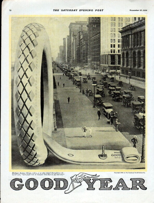 Мишлены начали впаривать там свои новые шины низкого давления «balloon tires», типа на них кайфовее кататься, ведь они давали нереальный комфорт, гасили лютую тряску и обеспечивали безопасность.