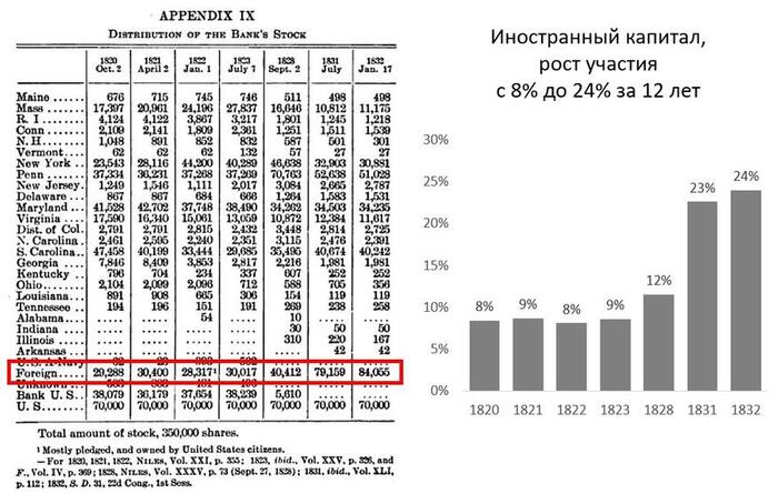 После окончания войны, в 1816 году был создан Второй Банк США. История с частным капиталом повторилась, 20% банка владело правительство, а 80% доли было распределено сдери нескольких тысяч акционеров, среди которых были правительства отдельных штатов, другие банки и частный капитал, в том числе иностранный. Однако большая часть капитала банка имела "американскую" прописку. Тем не менее с течением времени ситуация менялась, посмотрите на скриншот ниже: