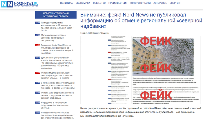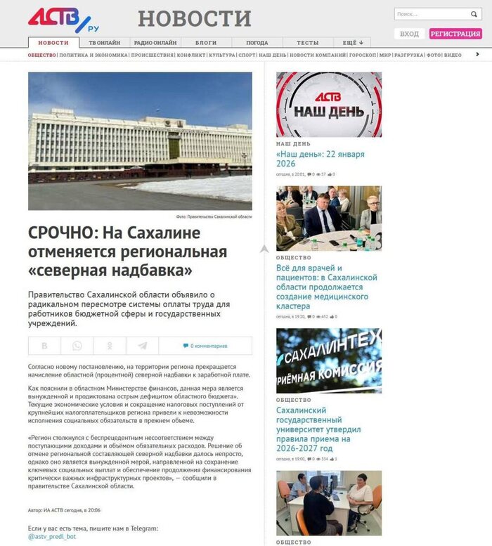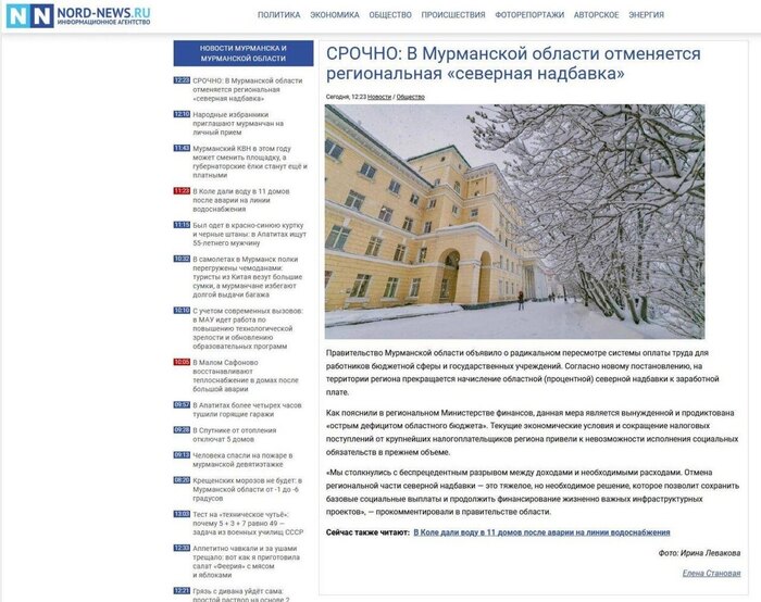 В Сети распространяют скриншоты с местных ресурсов СМИ — в Мурманской и Сахалинской области якобы отменят региональную процентную «северную» надбавку к зарплате работников госучреждений из-за дефицита бюджета.