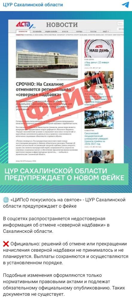 Центр управления регионом Сахалинской области также опроверг эту информацию: «Решений об отмене или прекращении начисления северной надбавки не принималось и не планируется. Выплаты сохраняются и осуществляются в установленном порядке».