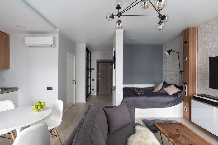 Скрытые зоны: спрячьте кровать или даже целую мини-кухню в нишу или шкаф. Утром закрыли дверцы – и у вас чистая гостиная, а не спальня.