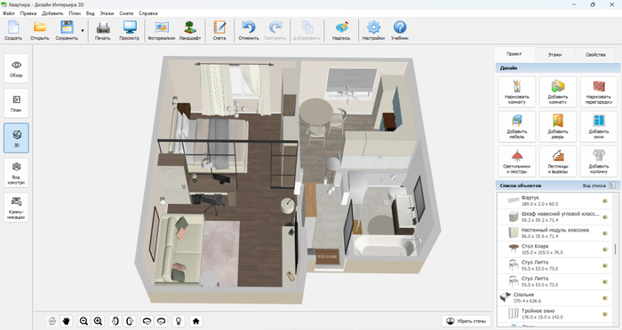 Вот этот стиль нам и приглянулся.Чтобы все идеи точно сработали, мы заранее составили план квартиры и визуализировали его в 3D, используя простую российскую программу Дизайн Интерьера 3Д. Это помогло нам, хотя мы вообще не дизайнеры! А вот наш проект, который получился в итоге: