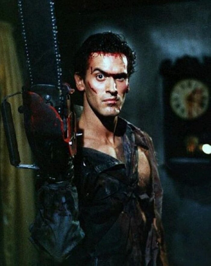 3) Брюс Кэмпбелл позирует для промо-фото к премьере ужастика "Зловещие мертвецы 2" (1987). Поскольку лесная хибара из первой части сгорела, для съёмок сиквела её интерьер был воссоздан на территории школы в городе Вадесборо, штат Северная Каролина. Причём, чтобы обеспечить всевозможные ракурсы для операторов, лачугу "подняли" над землёй на 2 фута. Одно из классных помещений школы, где проходили съёмки, было переоборудовано в спортзал, и Кэмпбелл активно тренировался там под руководством местного бодибилдера. Результаты этих тренировок можно заметить в сцене ближе к концу фильма, где герой Кэмпбелла показан в порванной рубашке.