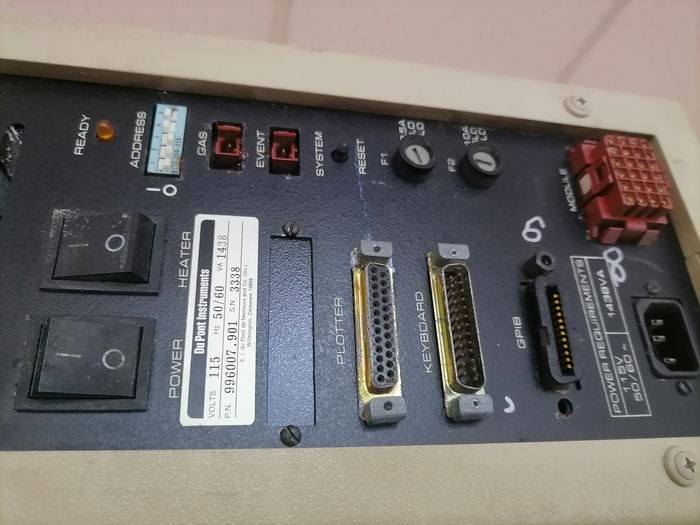 Попался интересный экземпляр, компьютер DuPont 9900 1987 года, на Intel 8088 с дополнительным оборудованием 943 TMA, DMA982, 901 CPU module: анализатор термо-механический, термический, колориметр, CPU модули (я так понял доп процессоры для обработки), целая лаборатория физико-химическая.