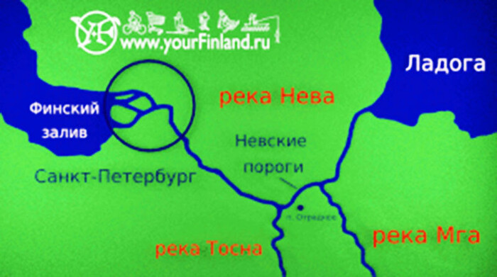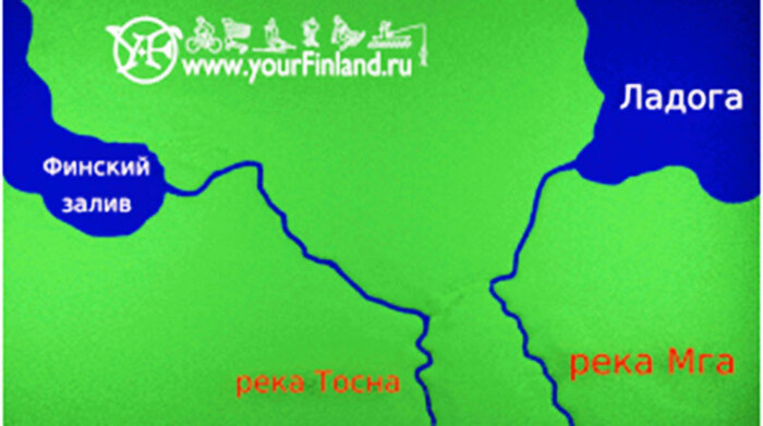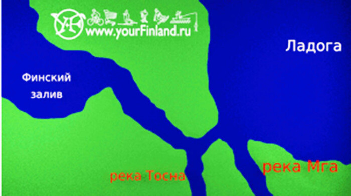 Первая картинка. Реки Тосна и Мга, нынешние левые притоки Невы, впадают первая в залив, вторая в Ладогу. Однако, где-то там у Ладоги тает ледник, уровень её повышается, и...