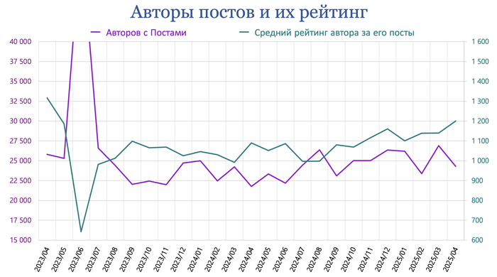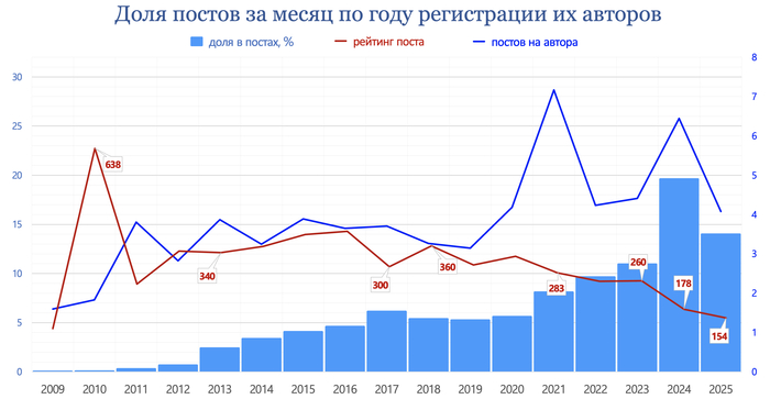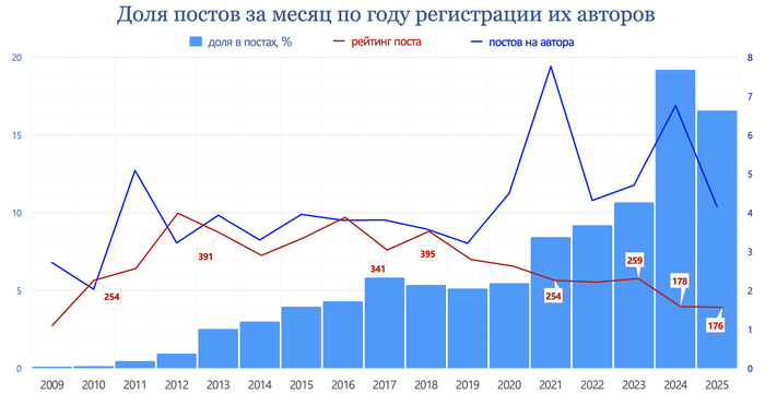 35 583 (30,4% постов, на 0,7% меньше предыдущего месяца), написанных 34,0% от всех авторов с постами, попали в Горячее.