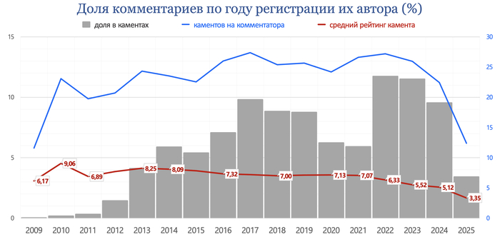 Из всех комментариев 1 218 имели рейтинг выше 1 000, 3 444 - от 500 до 1 000, 39 426 (1,0%) - от 100 до 500, 3 146 696 (80,4%) от 0 до 100. С отрицательным рейтингом - 541 768 (13,8%) комментариев.