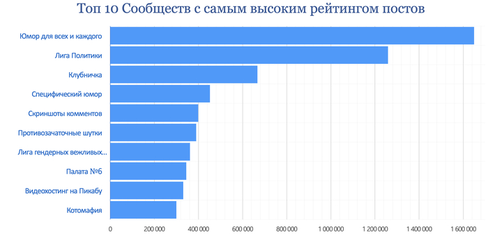 Кот - 2 621 постов за месяц, Юмор для всех и каждого - 2 488 постов за месяц, NSFW - 2 425 постов, Лига Политики - 1 599, Аниме[18+] - 1 454, Котомафия - 1 232, Аниме - 1 023, Лига гендерных вежливых срачей - 957, Клубничка - 932, Лига Геймеров - 876.