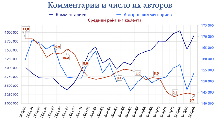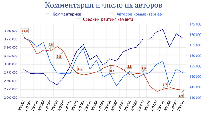 Всего за месяц написано 3 913 542 комментариев, из которых удалено 4 121 (0,1% от всех, на 51,5% меньше предыдущего месяца).