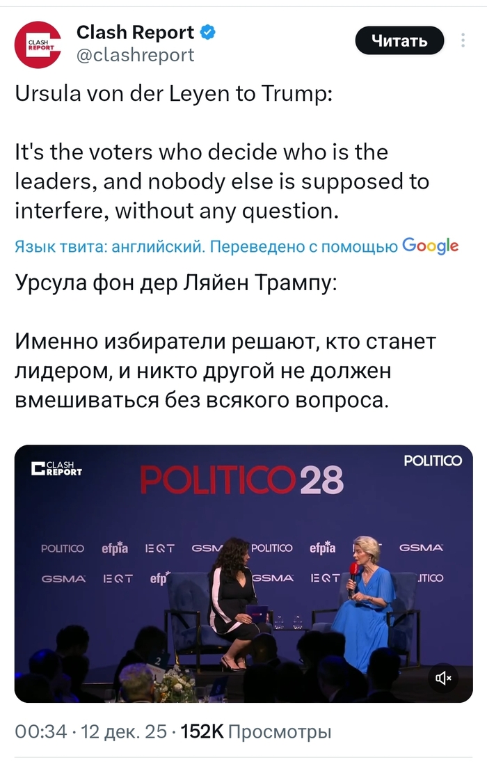 Госпожа фон дер Ляйен, ваши «лекции о демократии» звучат особенно цинично, когда вы сами представляете собой квинтэссенцию антидемократической системы - неизбранной, неподотчётной и абсолютно безумной. Продолжайте в том же духе. Каждая такая ваша речь - это ещё один шаг к краху того мира, который вы якобы защищаете.