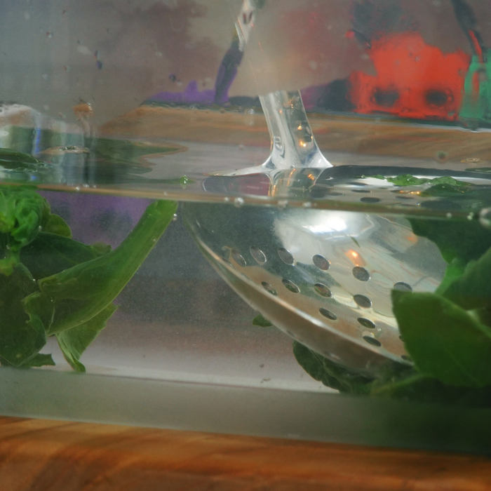7. Шпинат припустить на сковороде в 150-200 мл. подсоленной воды 5 минут постоянно помешивая. Затем шпинат тщательно отжать. Можно воспользоваться дуршлагом.