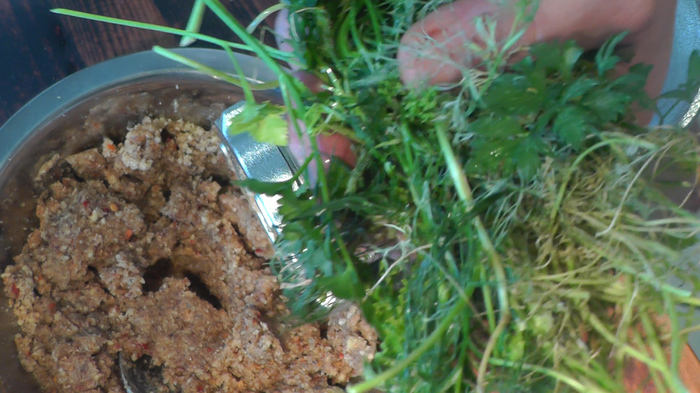 4. Нарезать мелко или размельчить на мясорубке укроп, петрушку, кинзу, сельдерей и репчатый лук
