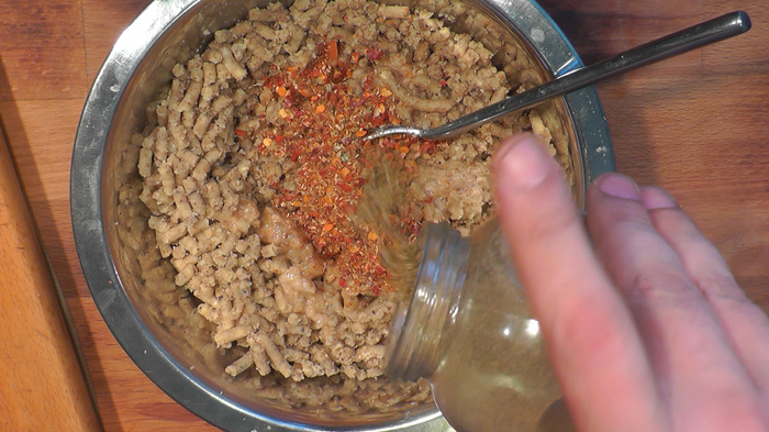 Готовим основу как и для пхали со свеклой. Отличие заключается в том, что для грибов я использую не острый а черный перец и уцхо-сунели. В отличие от хмели-сунели, которая включает в себя до 20 различных специй, уцхо-сунели это приправа, приготовленная из одной травы - голубого пажитника. И кстати, она сама обычно входит в состав хмели-сунели. Уцхо-сунели редко встречается в обычном магазине, но эту приправу вполне можно встретить в небольших магазинчиках продающих специи. Если не найдете, то можно смело заменить на хмели-сунели. Так же перемалывать основу, а заодно и перемешивать можно вместе с обжаренными грибами.