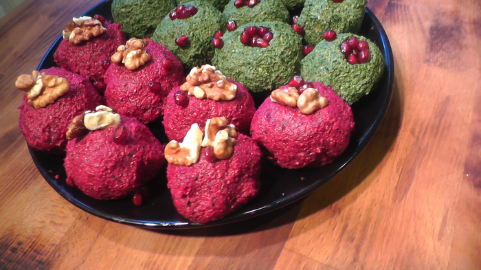 Далее смешиваем основу со шпинатом и формируем красивые шарики. Блюдо украшаем гранатом и веточками петрушки.