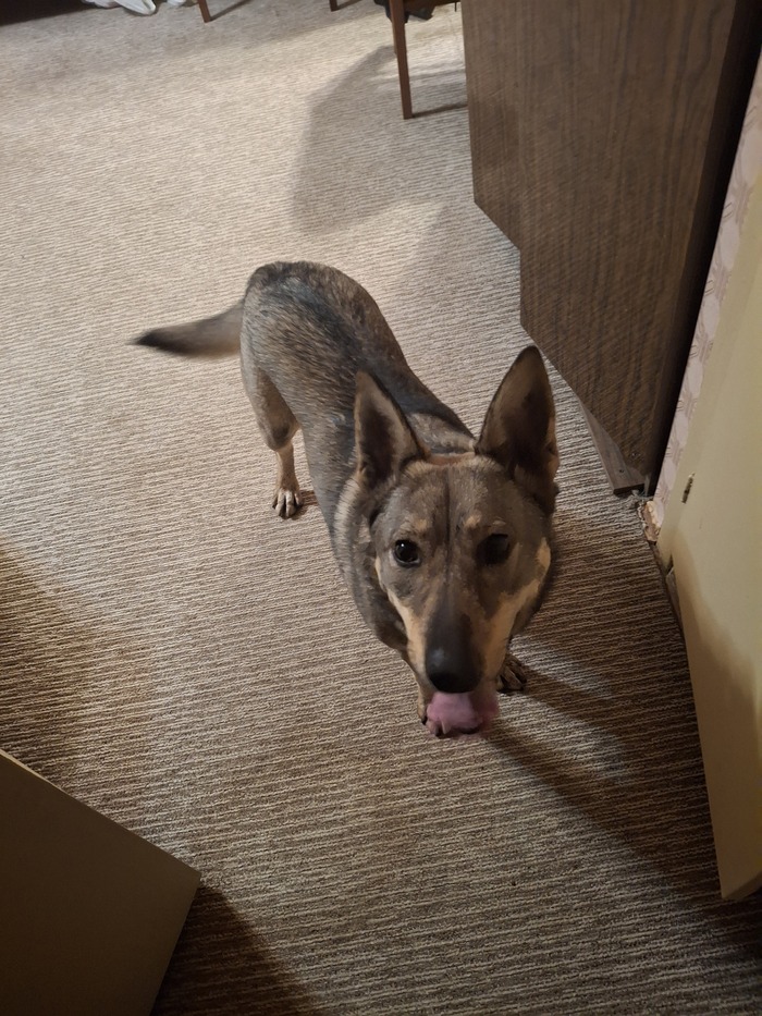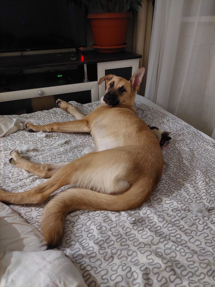 Она была найдена на промзоне завода. 2 мес вела дикий образ жизни, а после отлова еще месяц, примерно, была в изоляторе и потом попала ко мне. Вилка была очень пугливая и недоверяла никому. Сейчас она потихоньку успокаивается и больше не боится каждого звука, но всё еще ей непривычны толпы людей (собака-интроверт 😁)