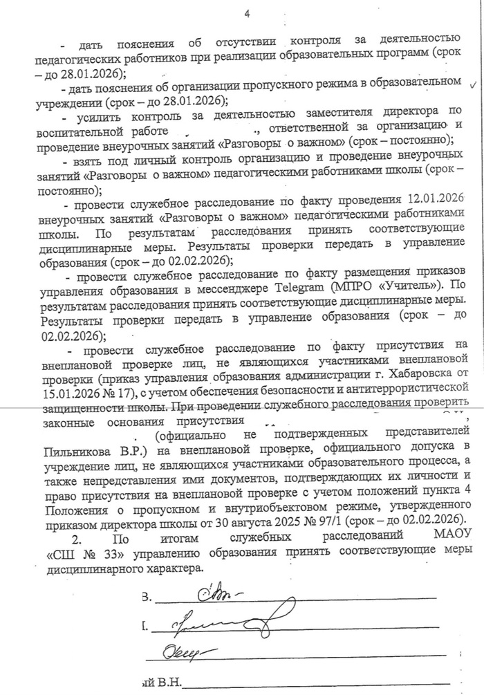 По итогам проверки чиновники потребовали от директора школы провести служебное расследование и применить дисциплинарные меры к сотрудникам, допустившим изменение программы 12 января. Руководству школы предписано взять под личный контроль проведение всех будущих «Разговоров о важном» и ужесточить надзор за заместителем директора по воспитательной работе. Кроме того, власти требуют найти виновных в «сливе» внутренних приказов о проверке в профсоюзный Telegram-канал, а также дать объяснения по организации пропускного режима из-за присутствия товарищей Вячеслава по профсоюзу во время проверки. Мера объясняется тем, что их присутствие оказывает влияние на «обеспечение безопасности и антитеррористической защищенности школы».