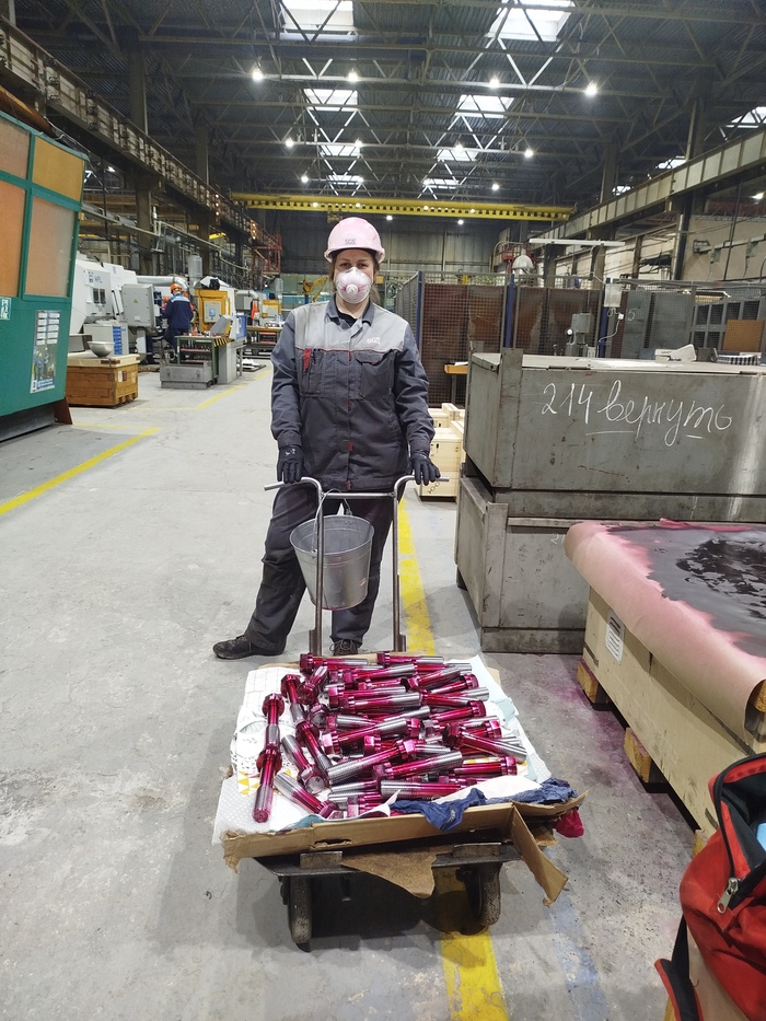 Какого-то особо места для сдачи этого говна, кхм, прастити...очень важных деталей, не предусмотрено. Поэтому нам пришлось сложить вот так в кучу то, что напшикали, чтобы не испачкать оставшееся место. Надо же потом проявитель наносить и ставить на чистое. А прежде надо начисто протереть 99 болтов от пенетранта. Мы поделились для продуктивности. Одна вытирала начисто, я вытирала с очистителем, наносила проявитель, отставляла в сторону. По сути это было не верно, ведь торец тоже идёт под контроль. Поэтому первые болтов 10, я сначала наносила проявитель на торец, дула на него, чтобы высох побыстрее (а ждать ваще надо 20 минут полного высыхания и только потом осматривать, дуть низя). Но на 10 +- болт мои щеки сказали 'пока'. И рука тоже, держа болт навесу. А ещё, когда делаешь глубокий вдох для продолжительного выдоха, офигенно хорошо вдыхаешь пары только что нанесенного проявителя. Так что торцы на страх и риск были проконтролированы никак.