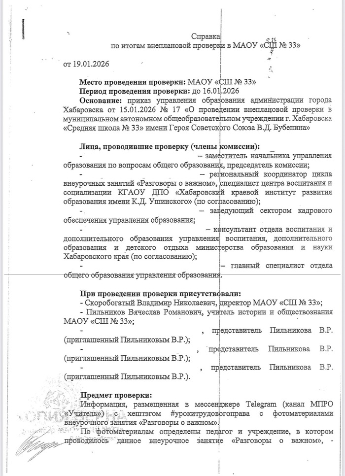 В Хабаровске завершена проверка в отношении учителя истории школы № 33 Вячеслава Пильникова, который дополнил плановую тему «Разговоров о важном» информацией о трудовых правах.