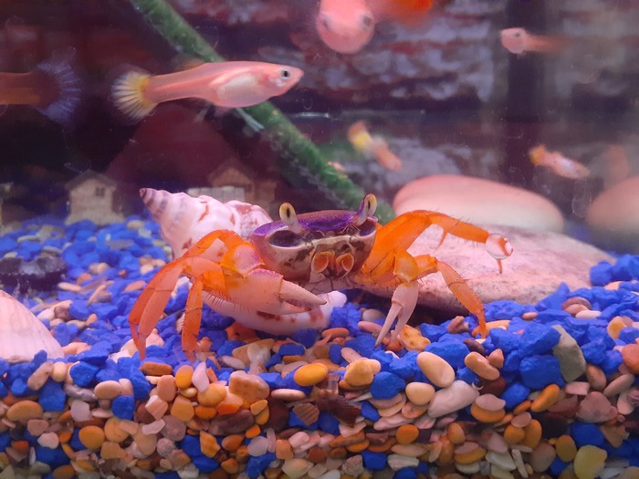 Федя здорова, за период с последнего поста полиняла всего раза 3 (ну а что вы хотели, взрослая уже), умудрилась один раз сбежать из аквариума пока нас с женой не было дома (погоняла котов и заставила отложить кирпичей: звуки бегающего по дому в темноте краба заставляют насторожиться).