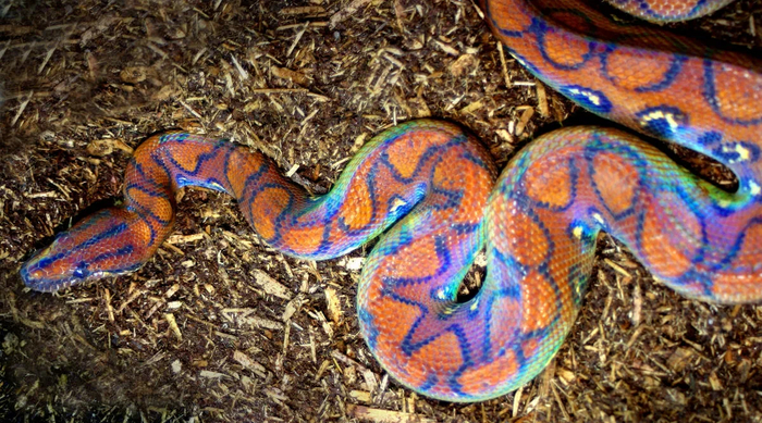 Радужные удавы активно размножаются в неволе. А если учесть их бомбезную окраску, неудивительно, что рептилия стала одним из самых популярных питомцев среди змей. К тому же нрав у них мягкий и покладистый, а живут абомы до 20 лет! источник